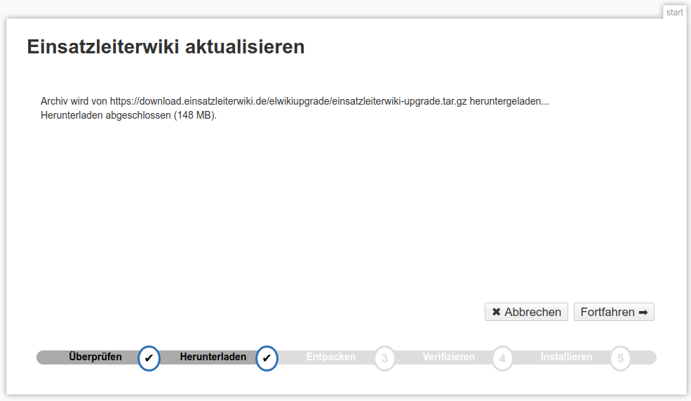 Jetzt wird die aktuelle Version des Einsatzleiterwikis inklusive aller Inhalte installiert. Veraltete Dateien werden automatisch gelöscht. Die Aktualisierung ist damit abgeschlossen. Mit einem Klick auf Fortfahren gelangen Sie zur Startseite. Damit ist die Aktualisierung abgeschlossen.