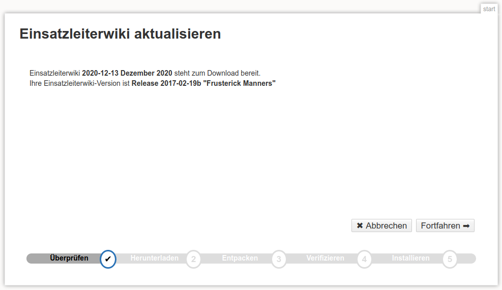 Nun wird überprüft, ob die neue Version des Einsatzleiterwikis in das Verzeichnis geschrieben werden kann bzw. ob bereits vorhandene Dateien überschreibbar sind. Bestätigen Sie wieder mit Fortfahren.