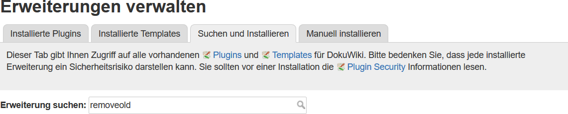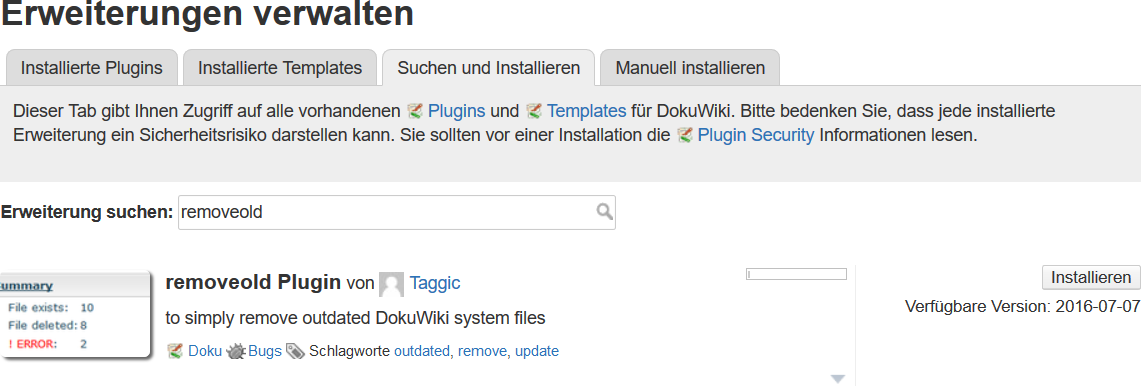 Sie sollten nun als erstes Ergebnis das removeold-Plugin angezeigt bekommen. Wundern Sie sich nicht über die englische Beschreibung, es wird auf den DokuWiki-Pluginkatalog zurückgegriffen, in welchem alle Einträge auf Englisch verwaltet werden.