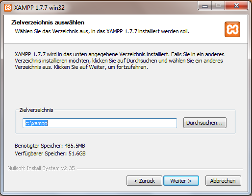 - Geben Sie das Verzeichnis an, in welches Sie die Serversoftware installieren wollen. Es ist eine gute Idee, die Vorgabe c:\xampp zu verwenden.