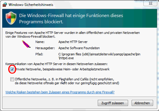 - Falls sich nun Ihre Firewall zu Wort meldet, so gestatten Sie dem Apache-Server die Kommunikation