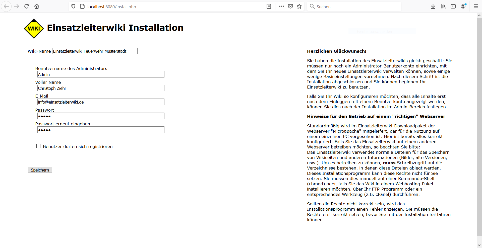 Nun öffnet sich die Installation, in dem Sie den Namen Ihres Einsatzleiterwikis und Ihr Admin-Benutzerkonto einrichten müssen.