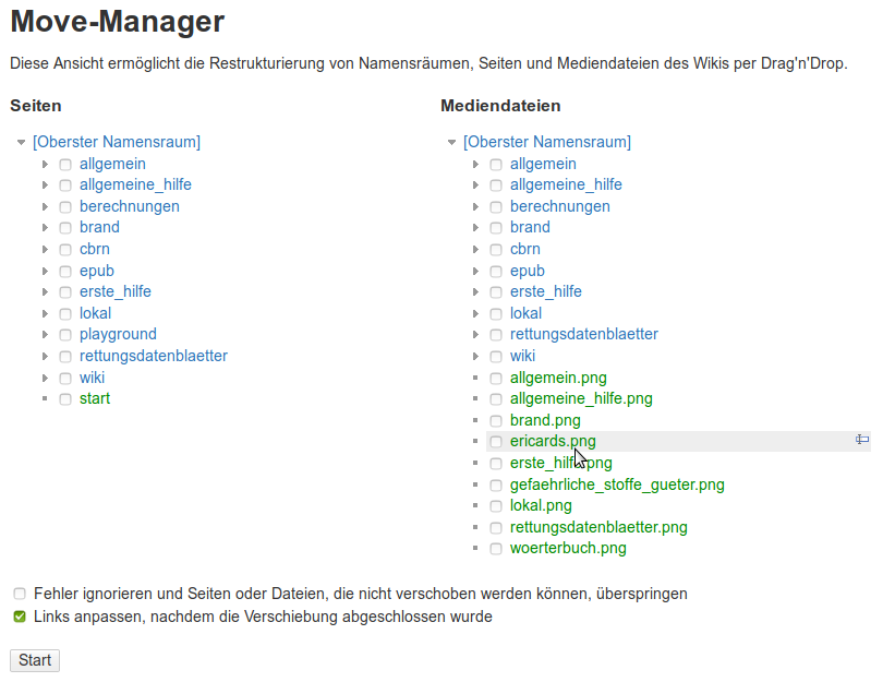 Auf der linken Seite sehen Sie die Namensräume und Seiten Ihres Wikis, auf der rechten Seite die Mediendateien. Diese können Sie nun einfach mittels Drag'n'Drop (anklicken und Maustaste gedrückt halten) in einen anderen Namensraum verschieben. Klappen Sie dafür den neuen Namensraum vorher durch einen Klick darauf auf. Wenn Sie mehrere Seiten/Dateien auf einmal verschieben möchten, klicken Sie bei allen die kleine Checkbox neben dem Namen an. Wenn Sie nun ein Objekt verschieben, werden alle anderen deren Checkboxen angehakt sind ebenfalls verschoben.