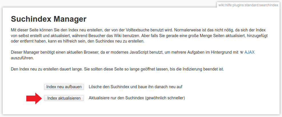 Der Suchindex ist erforderlich damit die Suche funktioniert, andernfalls werden Sie auf eine Suchanfrage keine oder unvollständige Ergebnisse erhalten. Diesen Schritt sollten Sie in Zukunft nach Synchronisationsvorgängen größeren Umfangs durchführen, da bei diesen der Suchindex des Einsatzleiterwiki-Servers nicht mit übertragen wird! Der Suchindex wird bei der normalen Benutzung zwar automatisch im Hintergrund erstellt, nach der Integration größerer Mengen Inhalt, die nicht selbst eingegeben werden, dauert es aber einige Zeit bis alle Seiten vom System erfasst sind.