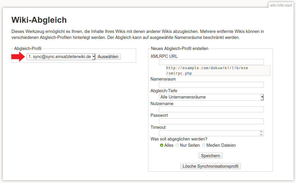XMLRPC URL: http://sync.einsatzleiterwiki.de/lib/exe/xmlrpc.php Namensraum: <leer lassen> Abgleich-Tiefe: Alle Unternamensräume Nutzername: sync Passwort : sync Timeout : 60 Was soll abgeglichen werden: Alles
