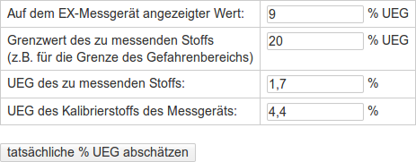 In der Theorie gibt es für jedes Ex-Messgerät bzw. den entsprechenden Sensor Umrechnungsfaktoren für den zu messenden Stoff. In der Praxis können aber einfach die Werte der UEG des Kalibrierstoffs und des zu messenden Stoffs ins Verhältnis gesetzt werden, da die sich hieraus ergebende Abweichung vom korrekten Umrechnungsfaktor wesentlich geringer ist als die Messungenauigkeit des Ex-Messgeräts.