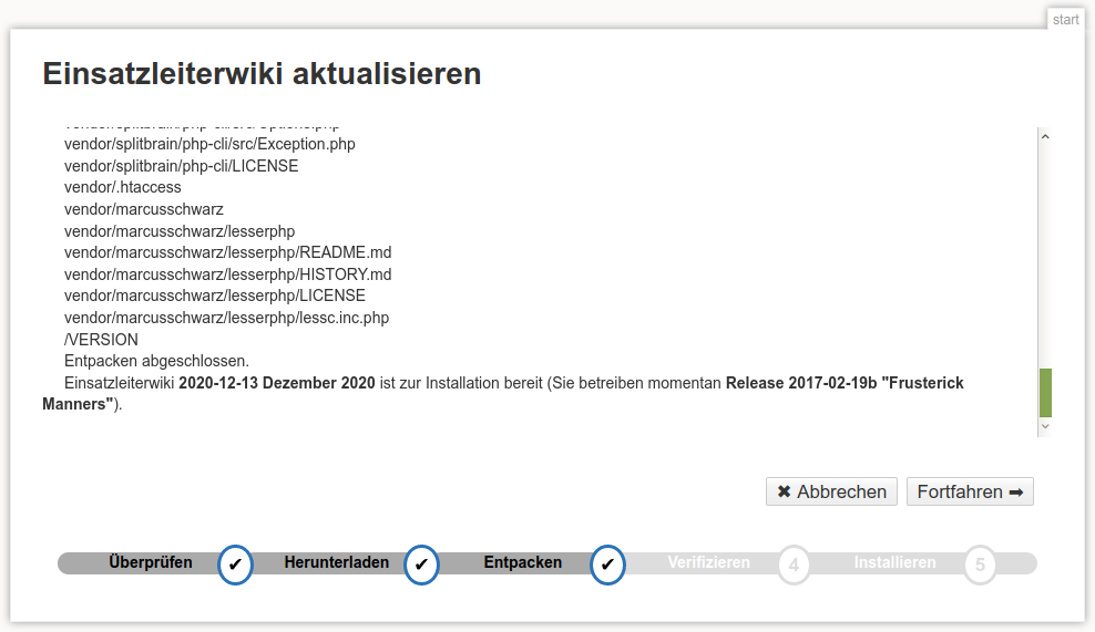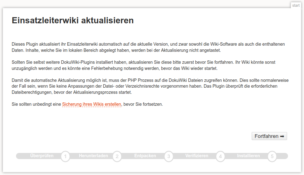 Nun wird überprüft, ob die neue Version des Einsatzleiterwikis in das Verzeichnis geschrieben werden kann bzw. ob bereits vorhandene Dateien überschreibbar sind. Bestätigen Sie wieder mit Fortfahren.