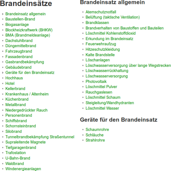 Hier sind verschiedene Szenarien aus dem Bereich der Brandeinsätze aufgelistet. In diesen Artikeln wird jeweils immer nur das einzelne Szenario behandelt. Relevante Zusatzhinweise wie z.B. das Vorgehen bei Photovoltaikanlagen sind in eigene Unterartikel ausgelagert, welche sich in der Unterkategorie Brandeinsatz allgemein befinden. Diese können dann im entsprechendem Artikel zum Szenario verlinkt werden. Daraus ergibt sich der Vorteil, dass die Datenpflege immer nur in einem Artikel, aber nicht an mehreren Stellen erfolgen muss.