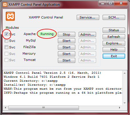 - Überprüfen Sie nun im Control Panel, ob der Server als Service eingerichtet ist und läuft