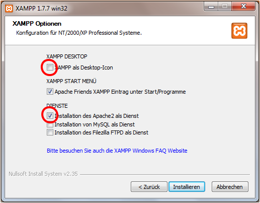 - Bei der Auswahl der Installationsoptionen können Sie auf das Anlegen eines Desktop-Icons verzichten, da Sie im späteren Betrieb normalerweise keine Anpassungen an der XAMPP-Software vornehmen müssen. Bereits jetzt sollten Sie aber den Apache-Server als Dienst einrichten, damit dieser bei jedem Systemstart automatisch mitgestartet wird. Falls Sie dies vergessen sind aber keine Konsequenzen zu befürchten; dies kann später nachgeholt werden.