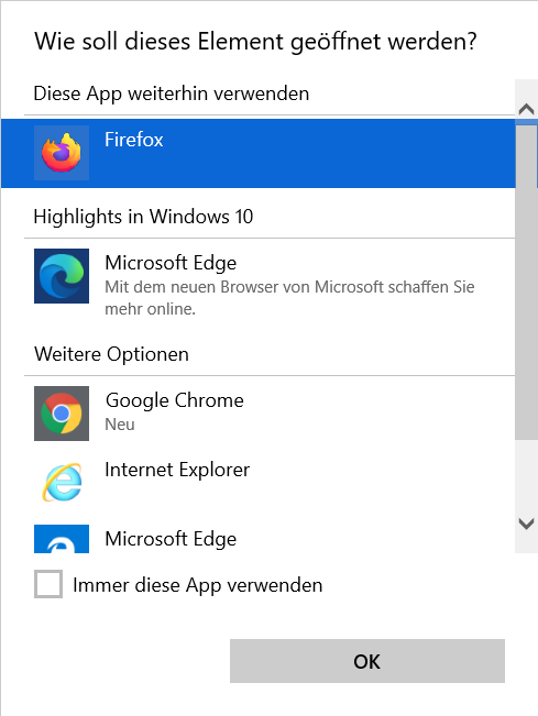 Eventuell werden Sie auf gefragt, mit welchem Browser Sie das Einsatzleiterwiki öffnen möchten. Dies wird auf den beiden nächsten Bildschirmfotos dargestellt: