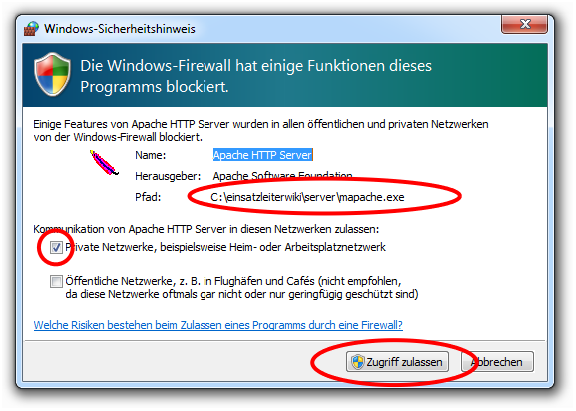 Gegebenenfalls öffnet sich parallel auch eine Abfrage der Windows-Firewall. Wenn Sie Ihr Einsatzleiterwiki nur auf Ihrem Computer benutzen, aber nicht mit anderen Rechnern aus dem selben Netzwerk darauf zugreifen möchten, können Sie das Fenster mittels eines Klicks auf Abbrechen schließen. Wollen Sie Ihr Wiki im Netzwerk betreiben, nehmen Sie die Einstellungen wie im folgenden Bild gezeigt vor. Beachten Sie, dass Sie außerdem noch den externen Zugriff in den Servereinstellungen erlauben müssen, damit andere Rechner auf Ihren Computer zugreifen dürfen. Aus Sicherheitsgründen ist diese Einstellung standardmäßig deaktiviert und muss erst wie im Artikel externen_zugriff_erlauben beschrieben aktiviert werden.