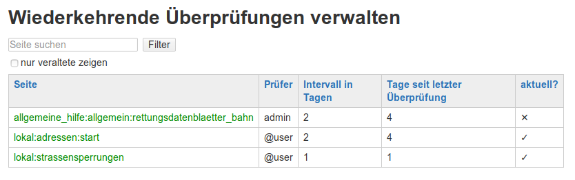 Soll eine Seite einmal pro Halbjahr von einem Benutzer überprüft werden der der Benutzergruppe einsatzvorbereitung angehört, so lautet das Kommando wie folgt. Beachten Sie dabei das @-Zeichen, dass eine Gruppe definiert.