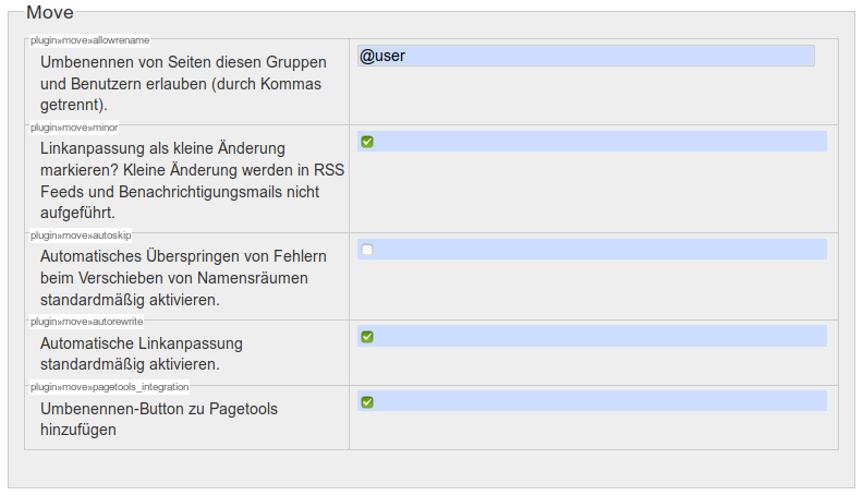 Das Plugin passt Zugriffsregeln nicht automatisch an. Sollten Sie die verschobene Seite bzw. Namensraum mit besonderen Regeln versehen haben, die z.B. das Lesen oder die Bearbeitung nur nach Anmeldung gestatten, so müssen Sie diese für den neuen Ort erneut vornehmen.