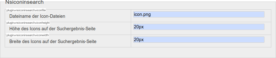 Nachdem Sie Ihr eigenes Icon hochgeladen haben, öffnen Sie die Konfiguration und gehen zum Abschnitt für das Plugin nsiconinsearch (alternativ klicken Sie hier). Sie sehen nun die folgenden Einstellungsmöglichkeiten: