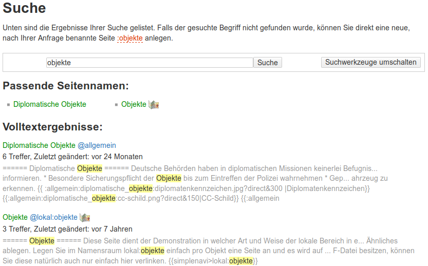 Das nsiconinsearch-Plugin zeigt Icons neben Suchtreffern an, um Ergebnisse aus bestimmten Namensräumen hervorzuheben. Im Einsatzleiterwiki wird standardmäßig ein Karten-Icon neben Ergebnissen angezeigt, die aus dem Namensraum lokal kommen.