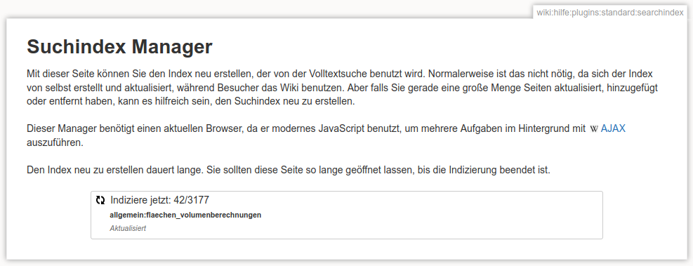 Der Suchindex ist erforderlich damit die Suche funktioniert, andernfalls werden Sie auf eine Suchanfrage keine oder unvollständige Ergebnisse erhalten. Diesen Schritt sollten Sie in Zukunft nach Synchronisationsvorgängen größeren Umfangs durchführen, da bei diesen der Suchindex des Einsatzleiterwiki-Servers nicht mit übertragen wird! Der Suchindex wird bei der normalen Benutzung zwar automatisch im Hintergrund erstellt, nach der Integration größerer Mengen Inhalt, die nicht selbst eingegeben werden, dauert es aber einige Zeit bis alle Seiten vom System erfasst sind.