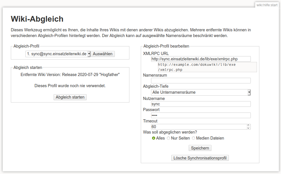 XMLRPC URL: http://sync.einsatzleiterwiki.de/lib/exe/xmlrpc.php Namensraum: <leer lassen> Abgleich-Tiefe: Alle Unternamensräume Nutzername: sync Passwort : sync Timeout : 60 Was soll abgeglichen werden: Alles