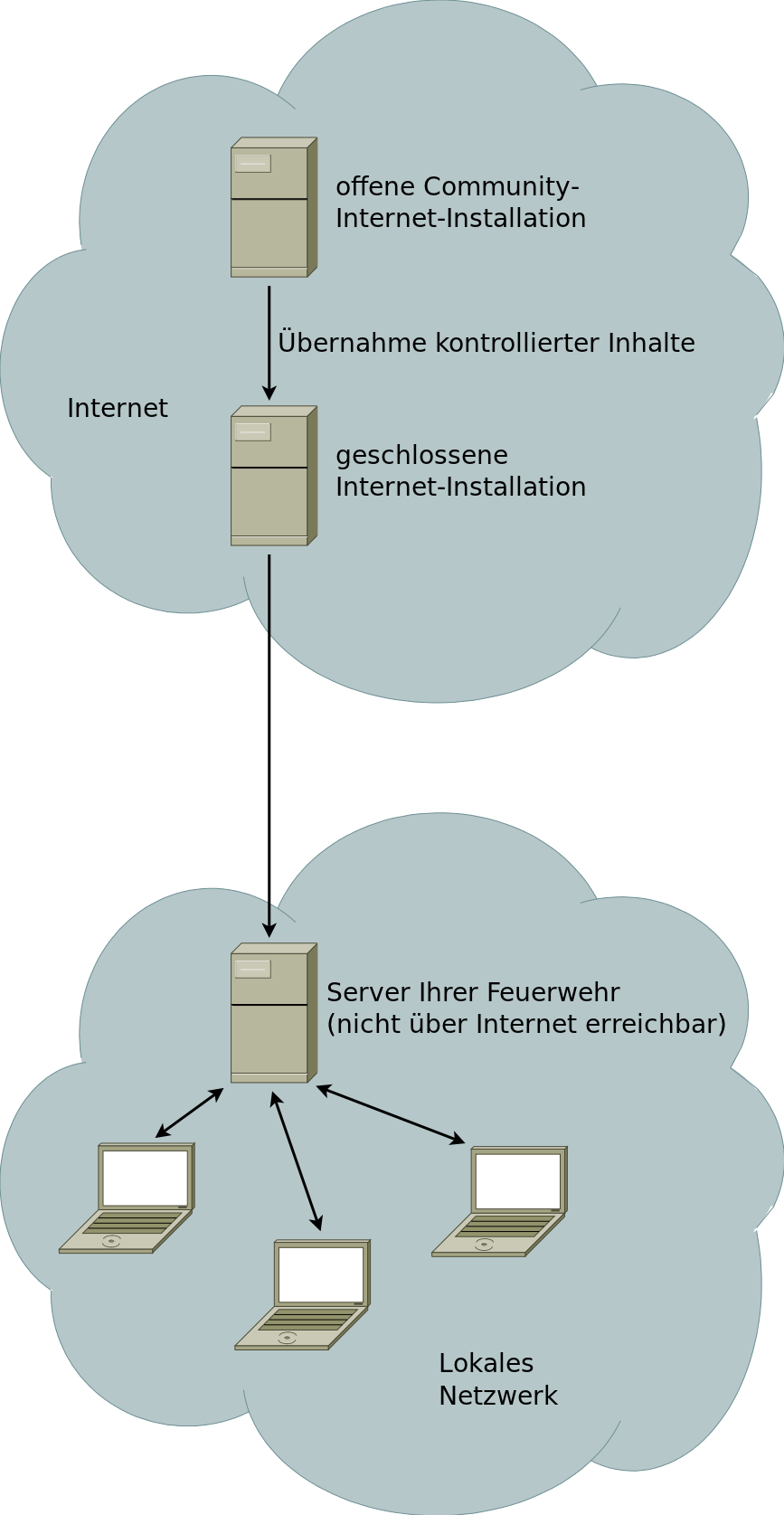 Wollen Sie das Einsatzleiterwiki auf mehreren Computern gleichzeitig nutzen, z.B. auf verschiedenen Fahrzeugen, so bietet es sich an eine Client-Server-Struktur aufzubauen. Ein Rechner, nennen wir ihn den Hauptrechner, führt die Updates der Inhalte mit dem Einsatzleiterwiki-Projekt durch. Zusätzlich werden auf diesem Computer die lokalen Daten eingepflegt. Sollten Sie das Programm in einer Feuerwehr mit mehreren hauptamtlichen Kräften oder größer betreiben, können Sie das Einsatzleiterwiki auf dem Hauptrechner im lokalen Netzwerk betreiben, sodass jeder Mitarbeiter direkt Änderungen und Ergänzungen eintragen kann. Die Computer welche sich auf den einzelnen Fahrzeugen befinden werden in regelmäßigen Abständen auf den neusten Datenstand gebracht. Auf ihnen muss davor die Software installiert werden.
