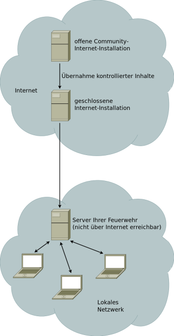 Dafür installieren Sie die Einsatzleiterwiki-Software auf einem über das Internet erreichbaren Computer, oftmals ist der Internet-Speicherplatz den Sie für die Homepage Ihrer Feuerwehr verwenden dafür geeignet und Sie müssen außer der Installation der Wiki-Software nichts weiter unternehmen bzw. betreiben.